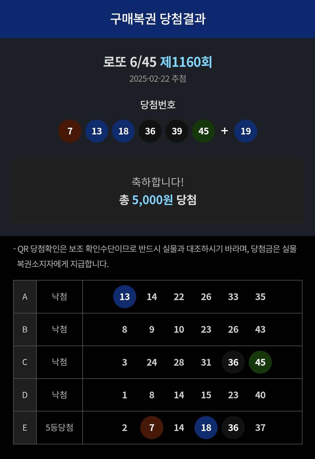 🎊 1등 당첨번호: 7, 13, 18, 36, 39, 45